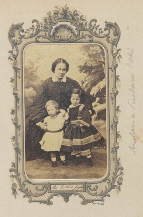 Ritratto in studio della Contessa (?) Zeti Viusani e figli; sullo sfondo un fondale dipinto raffigurante soggetti naturali