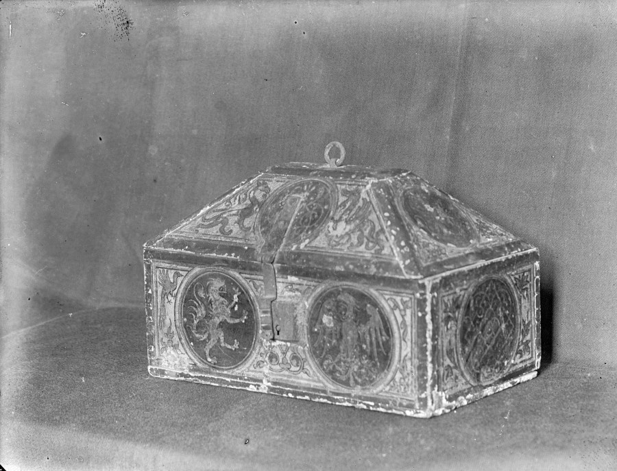 Riproduzione fotografica di un cofanetto con dipinti motivi fitomorfi e zoomorfi.