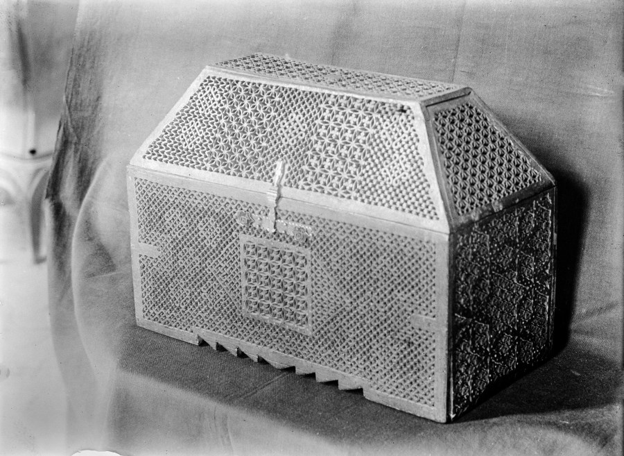 Riproduzione fotografica di un cofanetto con decorazioni geometriche intarsiate.