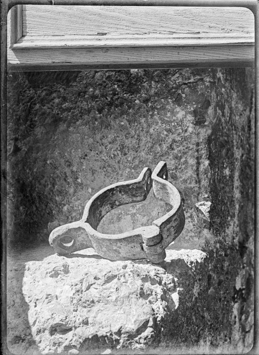 Riproduzione fotografica di un collare in ferro battuto, probabilmente per uso agricolo su un carro, posizionato su una roccia.