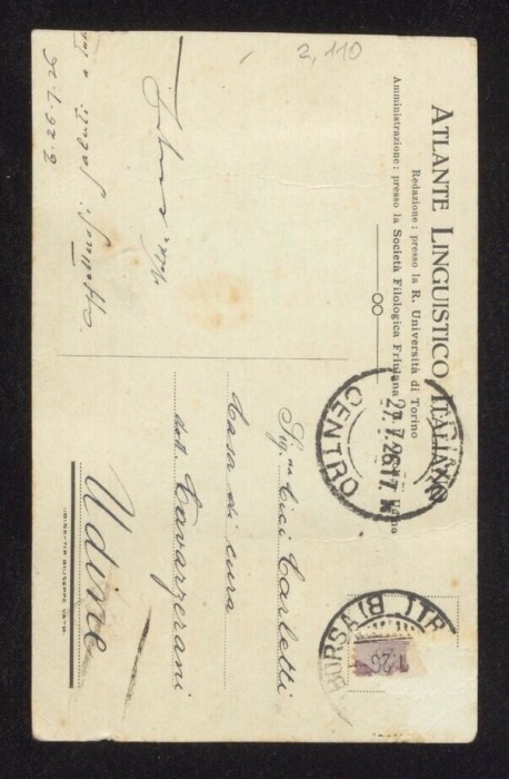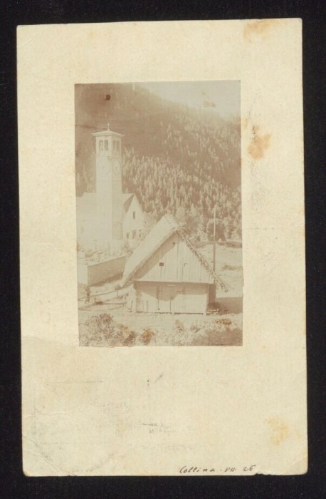 Veduta con la Chiesa di San Michele Arcangelo a Collina, frazione di Forni Avoltri. Un'iscrizione manoscritta in basso a destra sull'immagine data lo scatto al luglio 1926.