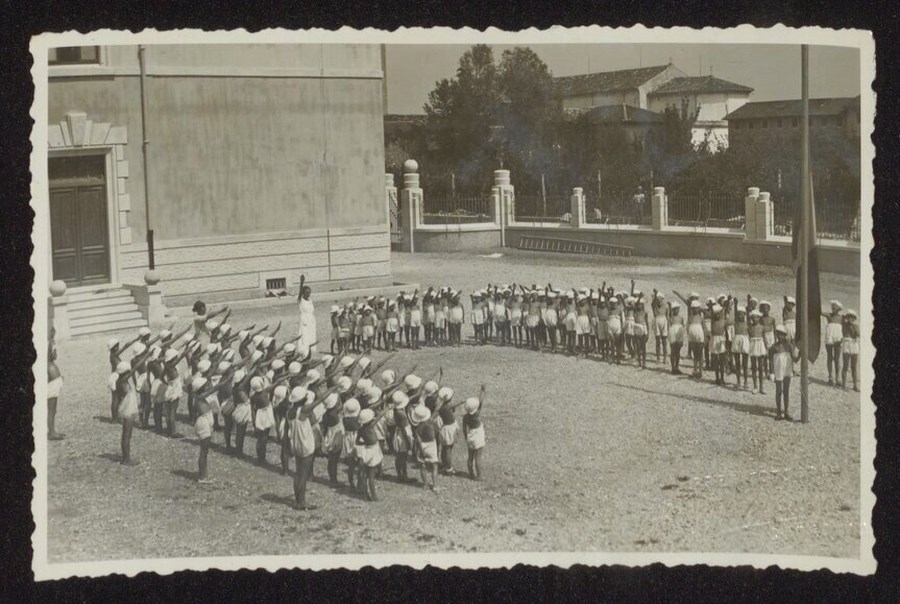 Il momento dell'alzabandiera alla Colonia assistenziale fascista di Sedegliano, nel cortile delle Scuole elementari progettate dall'architetto udinese Provino Valle a ridosso del 1930. Le istitutrici e i bambini sono disposti a semicerchio, in file ordinate, e ritratti nell'atto di fare il saluto fascista. Una annotazione sul verso data l'immagine al 28 agosto 1934. L'immagine è parte di un gruppo di complessive quattro fotografie.