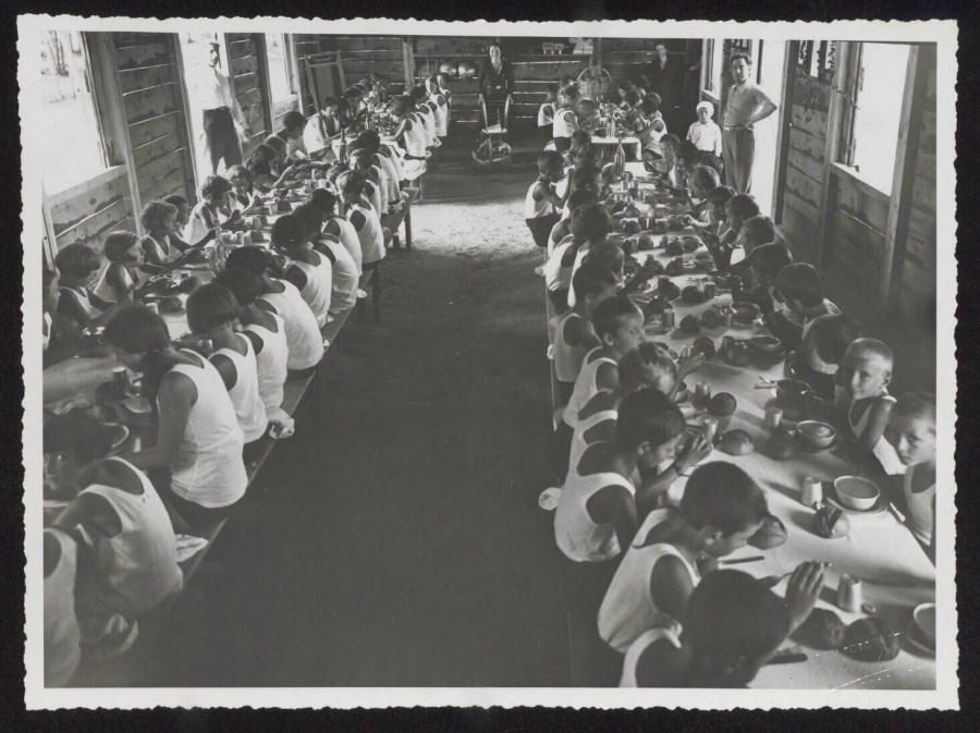 Ripresa del refettorio della Colonia assistenziale fascista di Varmo, il 30 agosto 1934, con i bambini seduti a tavola davanti alle loro ciotole piene di minestra, una pagnotta di pane davanti ad ognuno. La sala appare costruita con tavole di legno. Una assistente, sul fondo della sala, al centro dell'inquadratura è in piedi appoggiata allo schienale di una sedia, davanti alla quale è appoggiato un cesto. Un'altra assistente è in piedi sulla destra, sempre sul fondo della sala, mentre due uomini sono davanti allo specchio delle due porte che si aprono sulla pareti di sinistra e destra della sala.