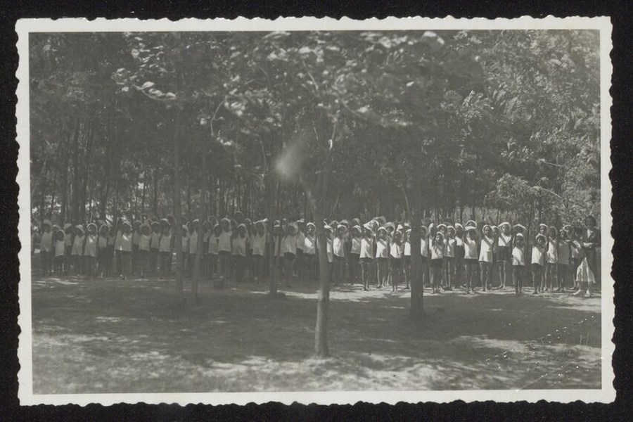Gruppo dei bambini presenti nella Colonia assistenziale fascista di Varmo, il 30 agosto 1934, ritratti in uno spazio verde alberato ed ombreggiato, nell'atto di fare il saluto fascista. All'estrema destra del gruppo, è posizionata una donna, verosimilmente l'assistente.