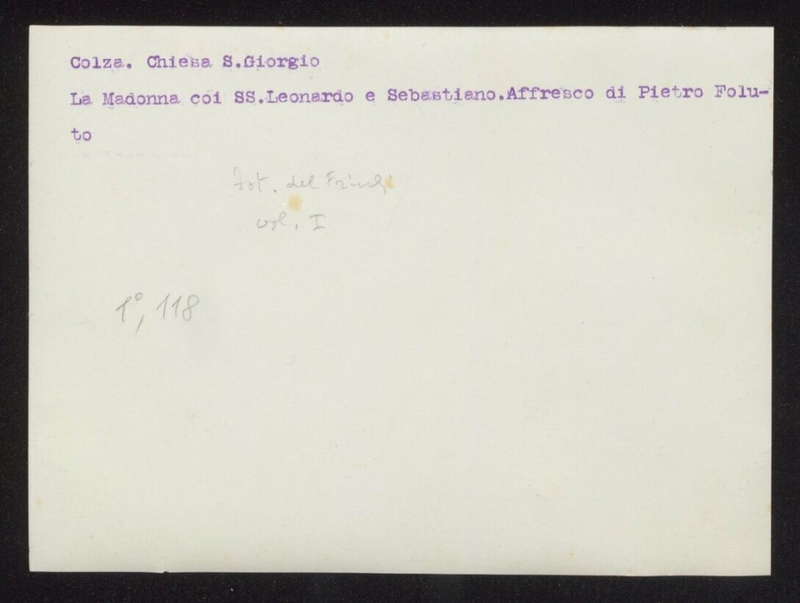 Affresco di Pietro Fuluto (1465-?) raffigurante la Madonna con i Santi Leonardo e Sebastiano, nella Chiesa di San Giorgio a Colza, località di Enemonzo. Con tutta probabilità allievo e forse anche collaboratore di Gianfrancesco da Tolmezzo, Pietro Fuluto affrescò, firmando e datando 1513, il presbiterio della chiesa di San Giorgio a Colza (Cristo benedicente, Dottori della Chiesa, Apostoli, Santi e scene della vita di S. Giorgio).