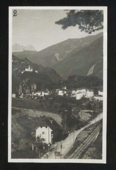 Veduta panoramica di Comeglians con ben visibili, in basso a destra nell'immagine, i binari della Ferrovia Villa Santina-Comeglians, o ferrovia del Degano, linea ferroviaria a scartamento ridotto che collegava i centri della Val Degano con il capolinea della ferrovia a scartamento ordinario della Carnia.