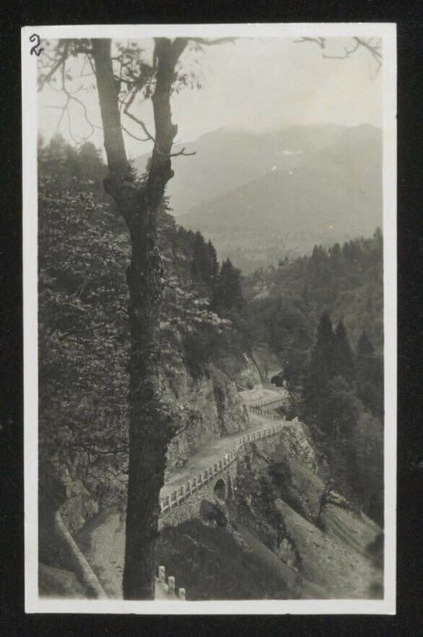 Veduta della strada che conduce al ponte in ferro sul torrente Degano a Comeglians.