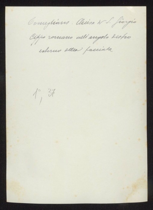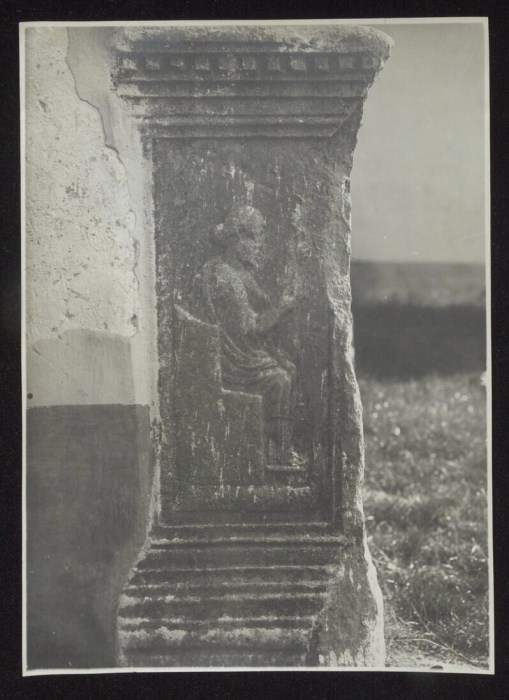 Comeglians. Chiesa di S. Giorgio. Cippo romano sull'angolo destro esterno della facciata