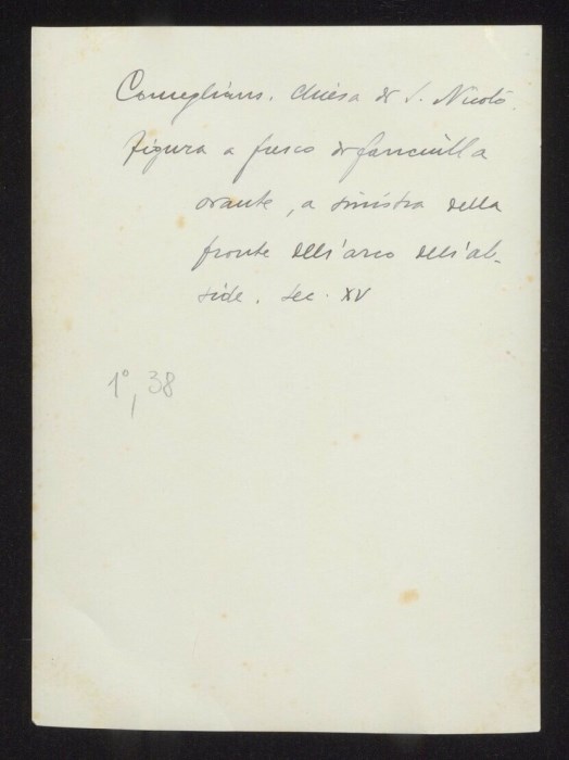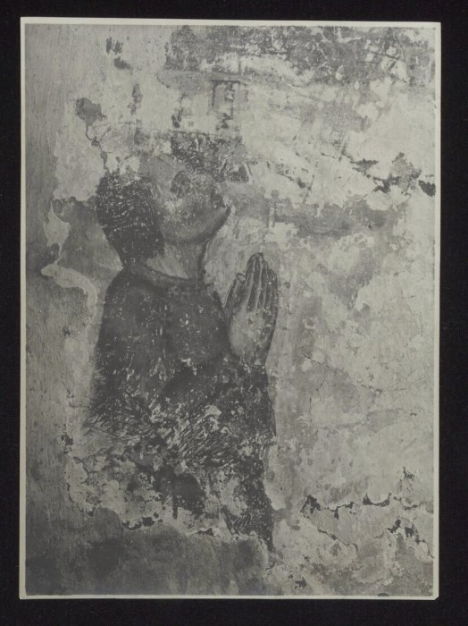 Comeglians. Chiesa di S. Nicolò. Figura a fresco di fanciulla orante, a sinistra della fronte dell'arco dell'abside. Sec. XV