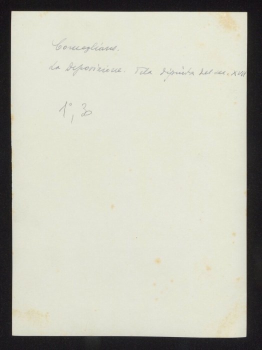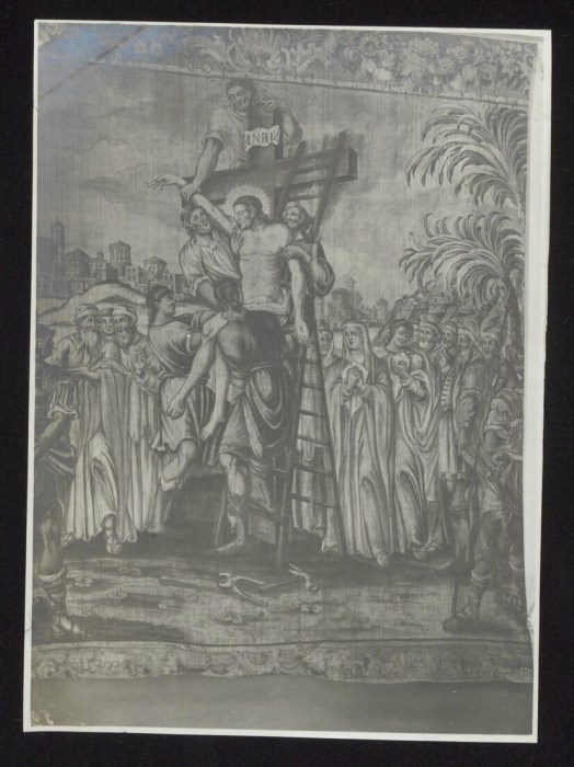 Telero dipinto con la Deposizione di Cristo dalla Croce, di ambito italiano del XVII secolo, collocato nella Cappella di San Luigi all'interno della chiesa di San Giorgio a Comeglians. Il telero era posto sulla parete a sinistra dell'altare. Sulla parte di destra, di medesima fattura, era collocato un altro telero con raffigurata la scena dell'orazione nell'orto, mentre sulla volta della cappella erano collocati altri teleri con la Crocifissione (vedi ID 954) e la Pietà (vedi ID 955).