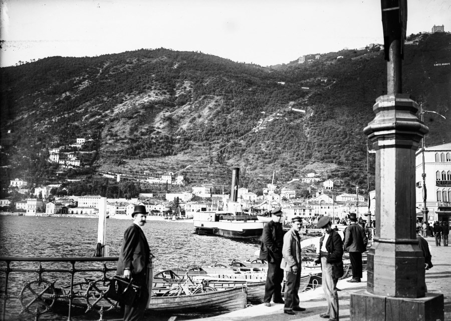 Veduta di Como, del lago e del paese di Brunate situato su un altopiano boscoso raggiungibile attraverso la funicolare che si vede nell'immagine. Nel lungo lago i turisti e, nel lago, le imbarcazioni.