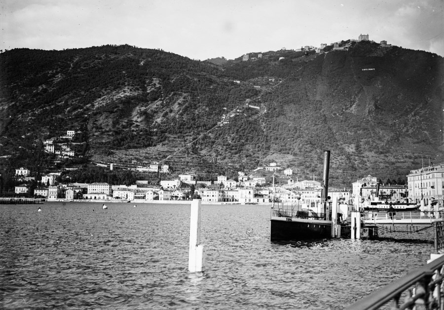 Veduta di Como, del lago e del paese di Brunate situato su un altopiano boscoso raggiungibile attraverso la funicolare che si vede nell'immagine. Nel lago le imbarcazioni per i turisti.