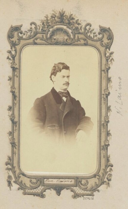Ritratto a mezzobusto in studio del Conte Nicolò Caimo (1830-1898). Ascritta sino dal 1548 alla nobiltà di Udine coll'ingresso nel consiglio nobile di Girolamo, la famiglia Caimo fu insignita dal Senato veneto, del titolo di conte di Tissano nella persona del dott. Giacomo, rinomato Professore di leggi allo Studio di Padova. Confermata nei suoi titoli con S.R.A. 28 febbraio 1821, venne in essa riconosciuta dal Governo Italiano e compresa nell'El. Uff. nella persona di Nicolò, di Giacomo, ultimo di sua stirpe. Nel sec. XIX il ramo del suddetto Giacomo aveva aggiunto al proprio il cognome dell'estinta famiglia dei Conti Dragoni quale erede della Contessa Giulia Dragoni, moglie del Conte Eusebio Caimo.