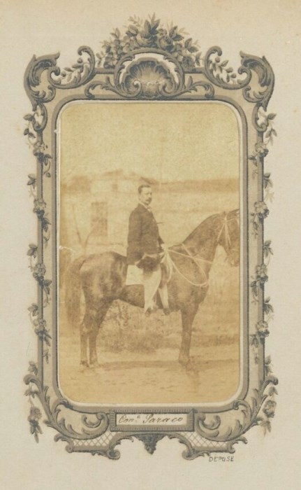 Ritratto in esterno del Conte Saracco in sella ad un cavallo nei giardini di un parco.