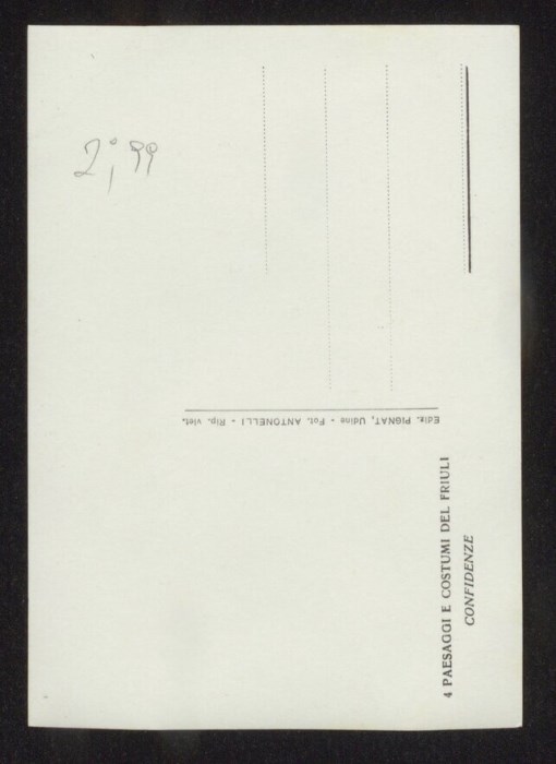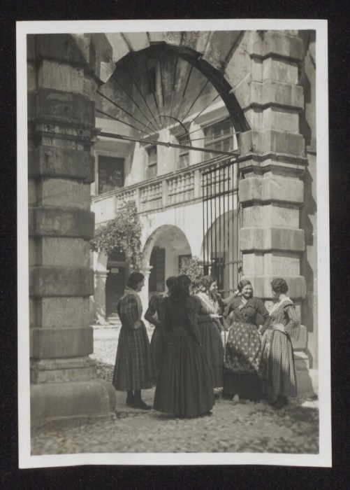 Lo scatto di Umberto Antonelli, farmacista e fotografo attivo in Carnia tra 1909 e 1949, è parte della serie di cartoline pubblicate dal fotografo editore Carlo Pignat con il titolo "Paesaggi e Costumi del Friuli" nella seconda metà degli anni Trenta del Novecento, raffiguranti tutte una Carnia e un Friuli arcadici. L'immagine ritrae un gruppo di donne in costume popolare friulano, mentre conversa sotto l'arco d'ingresso a Villa Frangipane-Pontoni (detta Il Palazzat) a Tarcento.