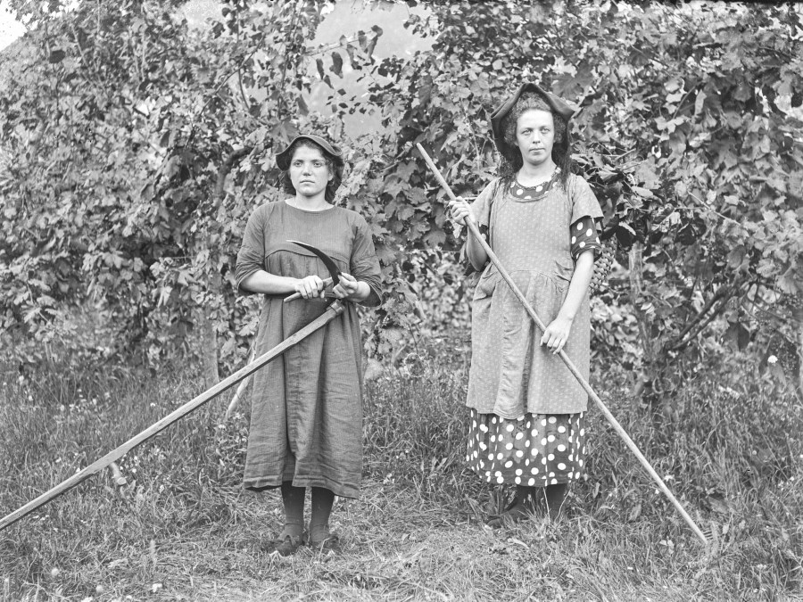 Ritratto di due contadine in posa in una campo: la donna a sinistra tiene in mano le falce, mentre la donna a destra un rastrello.
