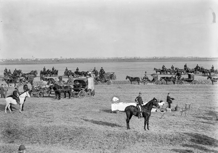 Convegno ippico nei prati di campagna: ritratto di uomini in divisa e in borghese seduti in sella ai cavalli e sulle carrozze. Un tavolo imbandito, una damigiana di vino ed alcune sedie al centro dell'immagine fanno pensare ad un momento conviviale che ha accompagnato il convegno.