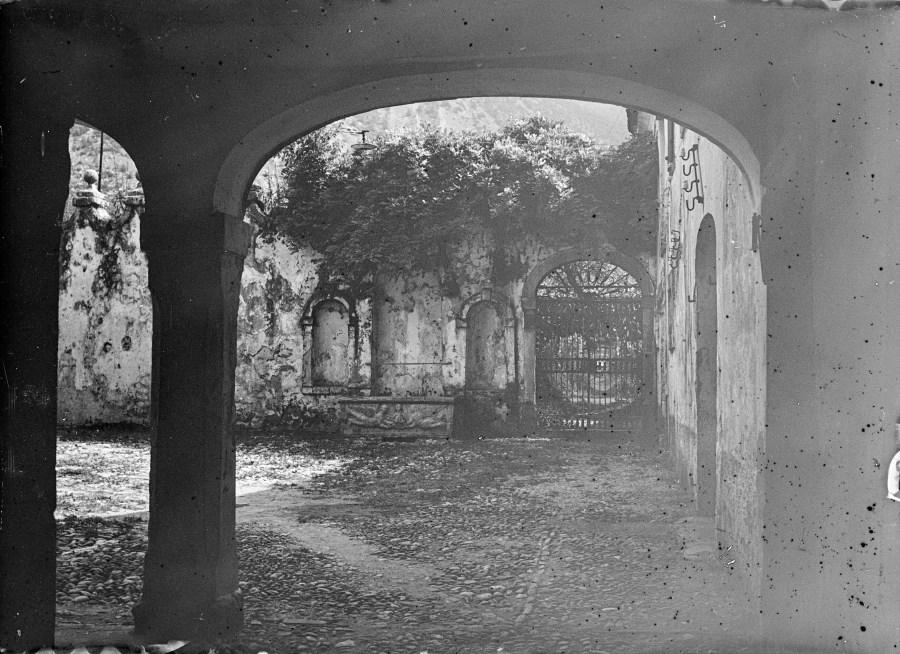 Cortile interno di una casa carnica con porticato e sarcofago addossato alla parete di fondo e portone in ferro battuto.