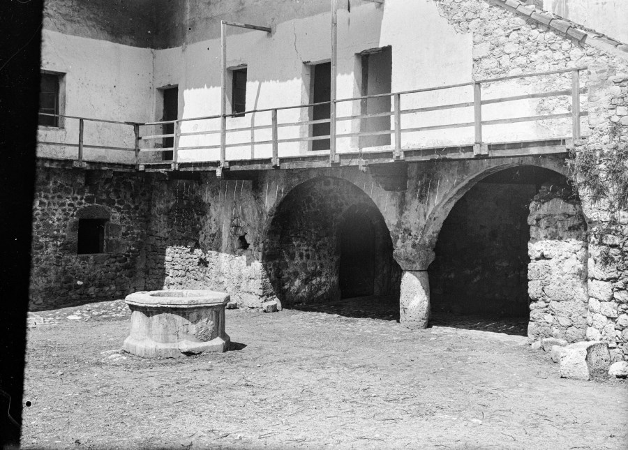 Veduta del cortile interno di un'edificio carnico con pozzo e lo stemma nobiliare in bassorilievo.
