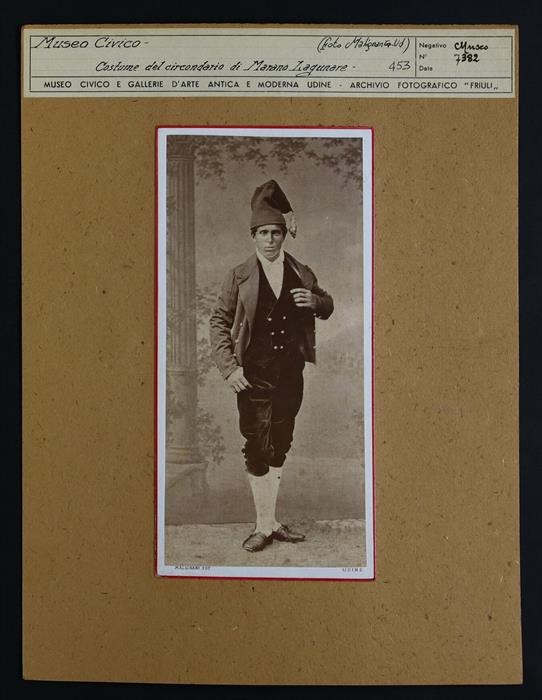 Udine, Musei Civici: uomo con un costume tipico della seconda metà dell'Ottocento e del circondario di Marano Lagunare. A sinistra, una colonna corinzia, parte del set fotografico appositamente allestito.