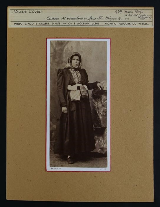 Udine, Musei Civici: donna con un costume tipico della seconda metà dell'Ottocento e del circondario di Resia, con la mano sinistra appoggiata su un masso.
