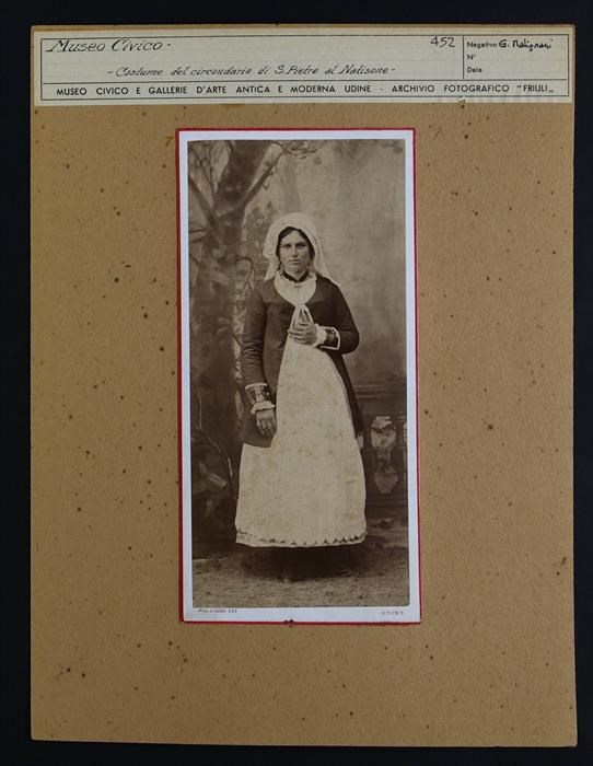 Udine, Musei Civici: donna con un costume tipico della seconda metà dell'Ottocento e del circondario di San Pietro al Natisone e la mano sinistra sull'addome. A destra si intravede una balaustra, parte del set fotografico appositamente allestito.