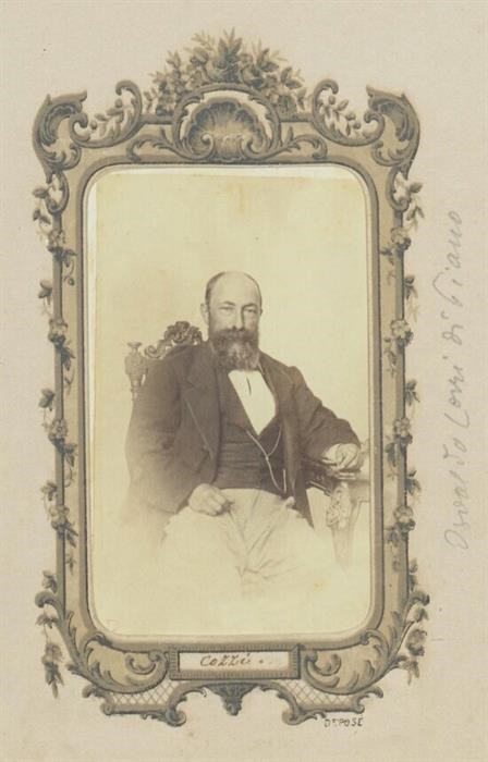 Ritratto in studio del signor Osvaldo Cozzi di Piano d'Arta. Si tratta di un rappresentante della famiglia Cozzi di Piano d'Arta che fin dal sec. XVIII era attiva nel commercio di legname, una delle attività più redditizie esercitate in Carnia da famiglie borghesi. I Cozzi figurano possidenti e membri dei principali organismi della rappresentanza locale (Quartiere di San Pietro), con ruoli di prestigio svolti in quel territorio fin dal periodo preunitario.