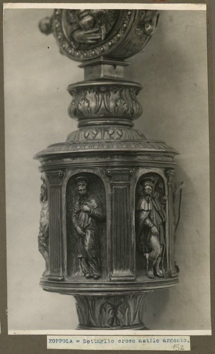 Riproduzione fotografica del particolare di una croce processionale in argento, con piccole figure di Santi, conservata presso la Chiesa di San Martino Vescovo a Zoppola.