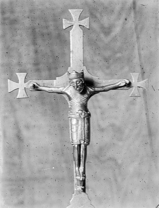 Riproduzione fotografica di un crocefisso in metallo probabilmente conservato presso il Duomo di Venzone.