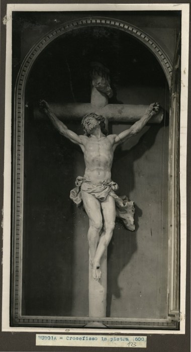Riproduzione fotografica di un crocefisso in pietra inserito in una nicchia e conservato presso la Chiesa di Santa Maria Maggiore a Dardago di Budoia.