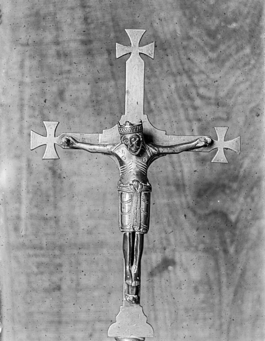 Riproduzione fotografica di un crocefisso metallico in stile longobardo.