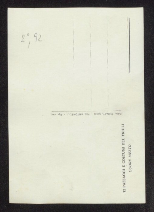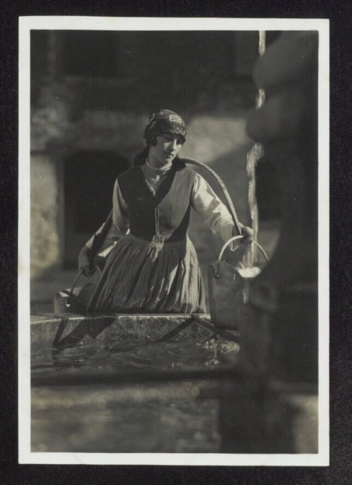 Lo scatto di Umberto Antonelli, farmacista e fotografo attivo in Carnia tra 1909 e 1949, è parte della serie di cartoline pubblicate dal fotografo editore Carlo Pignat con il titolo "Paesaggi e Costumi del Friuli" nella seconda metà degli anni Trenta del Novecento, raffiguranti tutte una Carnia e un Friuli arcadici. L'immagine ritrae in primo piano una donna in abito tradizionale carnico mentre prende l'acqua con il classico arconcello e i due secchi di rame, alla fontana di Tredolo a Forni di Sotto.
