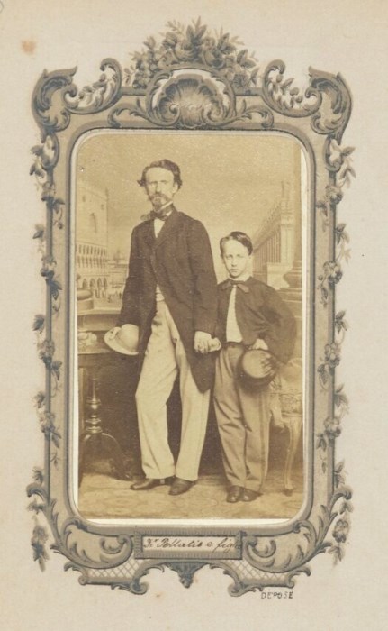 Coppia Pellatis, padre e figlio, ritratti in studio; alle loro spalle un fondale raffigurante Venezia.