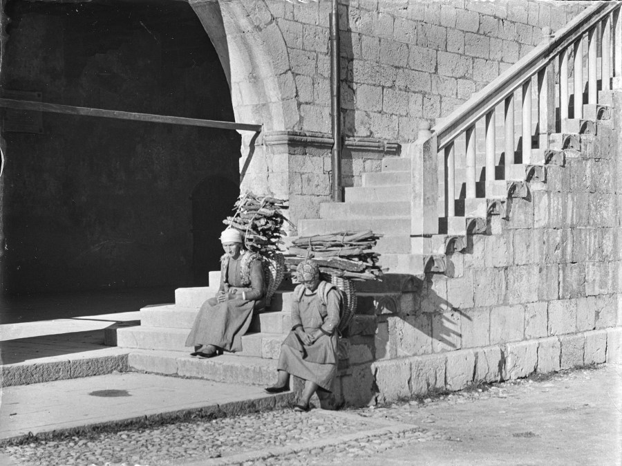 Ritratto di due contadine con gerle sulle spalle, cariche di legna, siedono in preghiera sulle scale del Palazzo Comunale di Venzone.