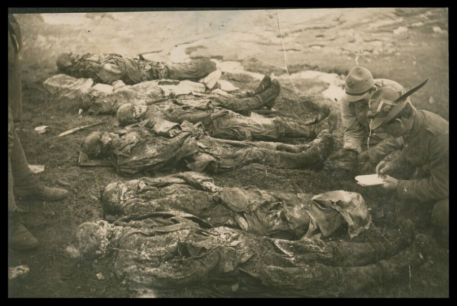 Due militari procedono all'identificazione di un gruppo di salme di caduti della Grande Guerra