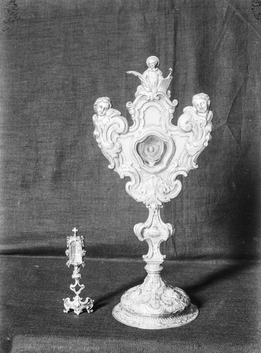 Riproduzione di due reliquiari posizionati su un fondale di tela scura per la documentazione fotografica.