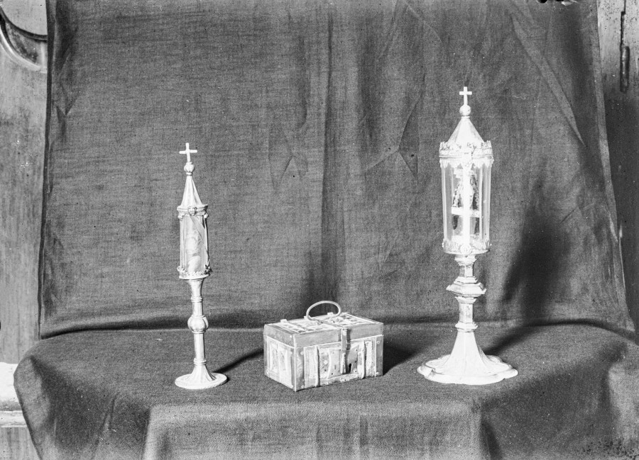 Riproduzione di due reliquiari ed un cofanetto posizionati su un fondale di tela scura per la documentazione fotografica.