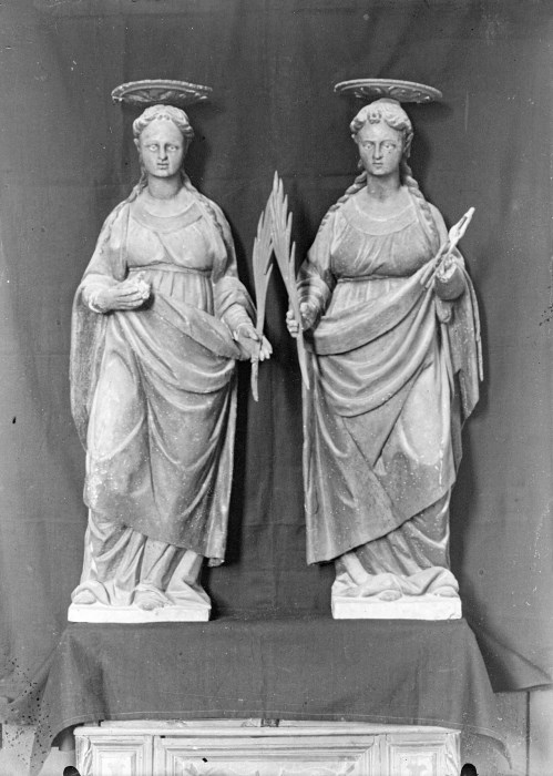 Riproduzione fotografica di due sculture lignee di sante martiri su un piedistallo posizionate su una struttura lignea coperta da fondale in tela nera per la documentazione fotografica.