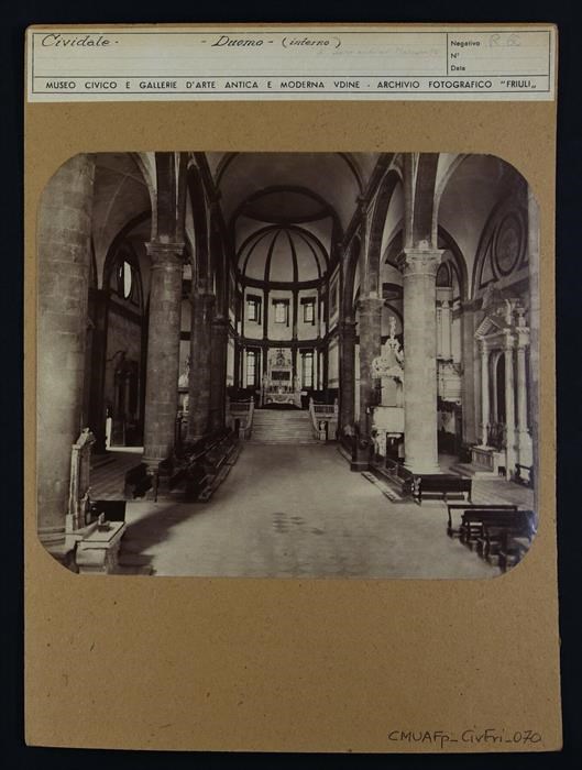 Cividale del Friuli: interno del duomo di Santa Maria Assunta, ripreso dalla navata centrale. L'ambiente, suddiviso in tre navate, presenta colonne monumentali e interventi del XVIII secolo. La prospettiva è conferita dalle paraste e controparaste, realizzate dalla bottega Lombardo. La scalinata settecentesca, che porta all'altare maggiore e al presbiterio sopraelevato, è stata costruita con marmi antichi ed è coronata dalle statue della Fede e della Speranza e da quelle degli Evangelisti.