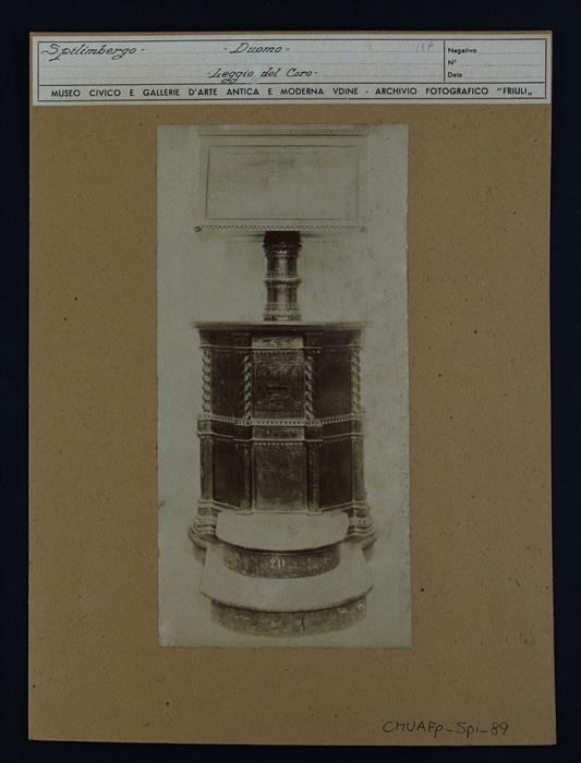 Spilimbergo, chiesa dei Santi Giuseppe e Pantaleone: leggio in legno con due gradini e con intaglio e tarsie di Marco da Vicenza (1477), proveniente dal duomo di Spilimbergo.
