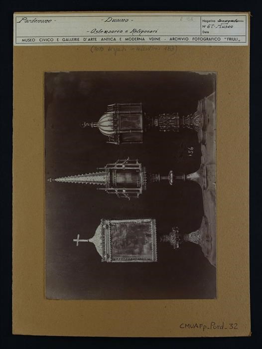 Ostensorio quattrocentesco a cupola con guglia decorato con smalti e ceselli, un reliquiario con cuspide a base quadrata e uno con piccoli archi.