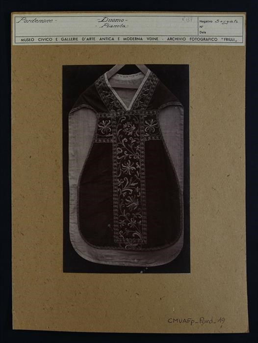 Pordenone, duomo: la pianeta (paramento liturgico), parte anteriore con croce a forma di Tau, all'interno della quale sono presenti decorazioni fitomorfe.