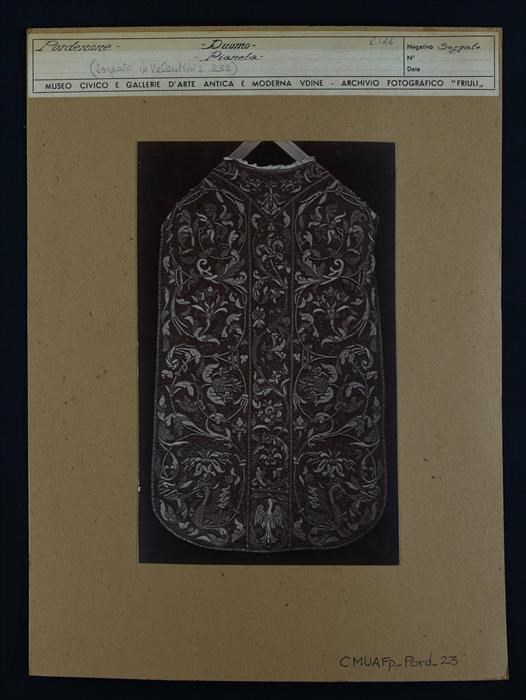 Pordenone, duomo: la pianeta (paramento liturgico), parte posteriore in cui sono presenti decorazioni fitomorfe e floreali ricamate e, in basso al centro, un'aquila.