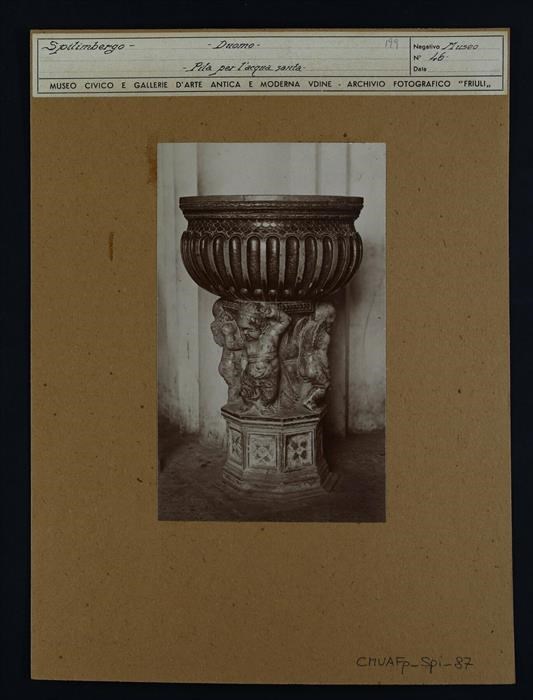 Spilimbergo, duomo di Santa Maria Maggiore: acquasantiera (vicino al portale nord) con fusto a base ottagonale decorato da putti con ali in altorilievo, opera di Maestro Giorgio (1466).