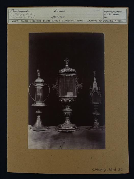 Partendo da sinistra, un esemplare trecentesco di tipo romanico con ricettacolo cilindrico e tre anse (sulla cui sommità si colloca la statuetta di un vescovo), un reliquiario di epoca rinascimentale a forma di fanale con cartiglio interno e uno in gotico.