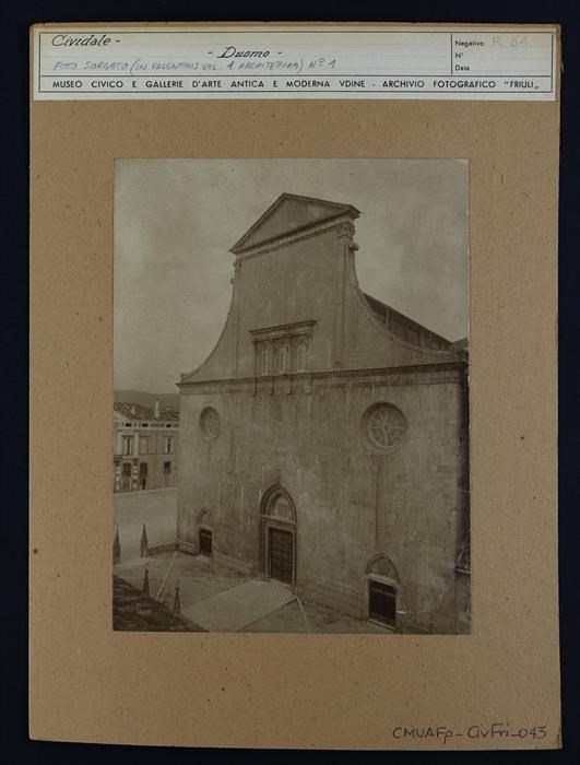 Cividale del Friuli: facciata e campanile del duomo di Santa Maria Assunta. La facciata è stata costruita da Bartolomeo della Cisterna e Pietro Lombardo. In basso a sinistra, i quattro pinnacoli all'ingresso dell'edificio religioso.