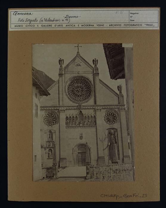 Gemona del Friuli, duomo: facciata opera dell'architetto e scultore Giovanni detto Griglio (fine del XIII secolo), autore anche della monumentale scultura di San Cristoforo. Si intravedono, a destra e a sinistra, due abitazioni. Sullo sfondo, in alto a sinistra, il monte Glemina.