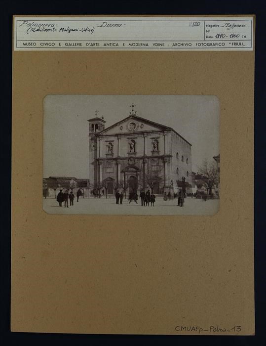 In primo piano, diverse persone nella piazza principale (piazza Grande) davanti alla facciata, composta da due ordini: in quello inferiore sono collocate quattro semicolonne, mentre in quello superiore si trovano le statue del Redentore, San Marco e Santa Giustina.