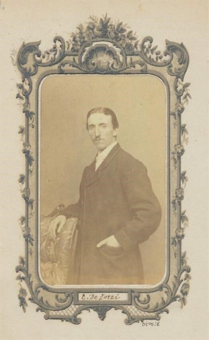 Ritratto in studio del signor E. De Zorzi accanto ad una poltroncina foderata