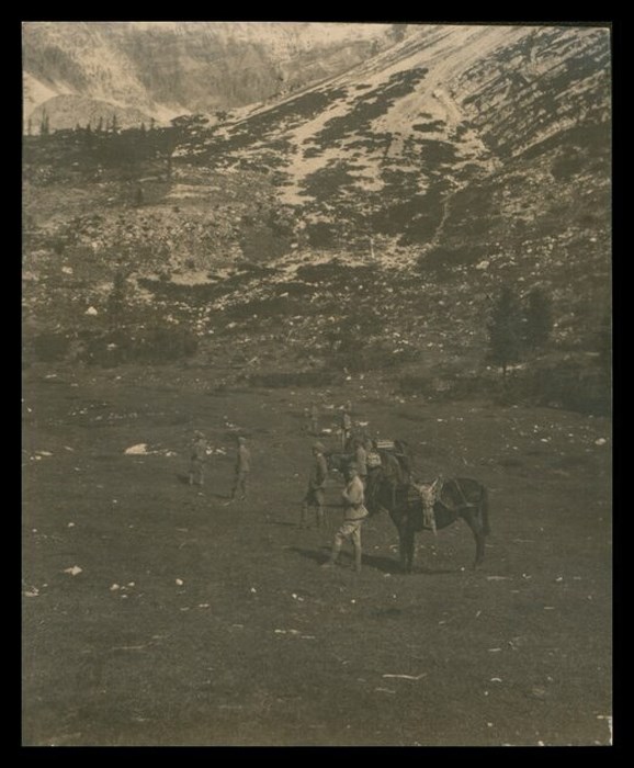 Squadra di militari destinati alla ricerca delle salme dei caduti della Prima Guerra mondiale, con muli da soma in un pianoro erboso in montagna